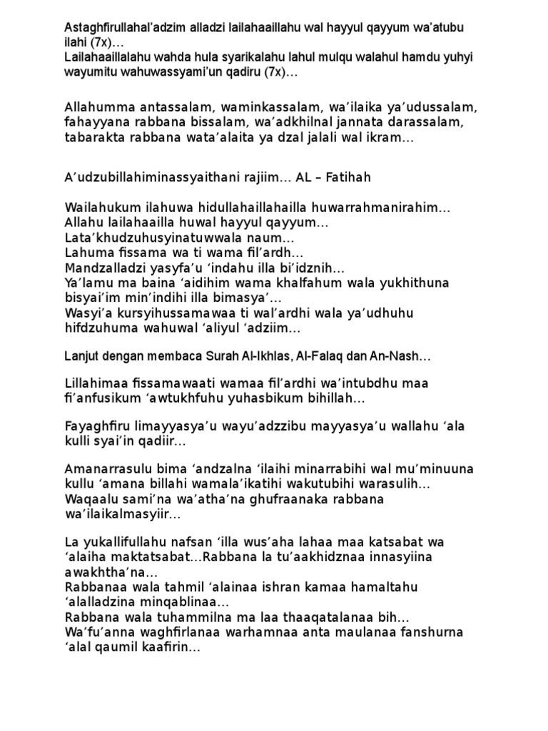 Robbana wala tuhammilna ma la to kotalana bih.wa'fu'anna, wagfirlana, warhamna, antamaulana fansurna 'alal kaumil ka firin.robbana ma kholaqo ta haza ba tila, subhanaka faqina 'aza bannar.